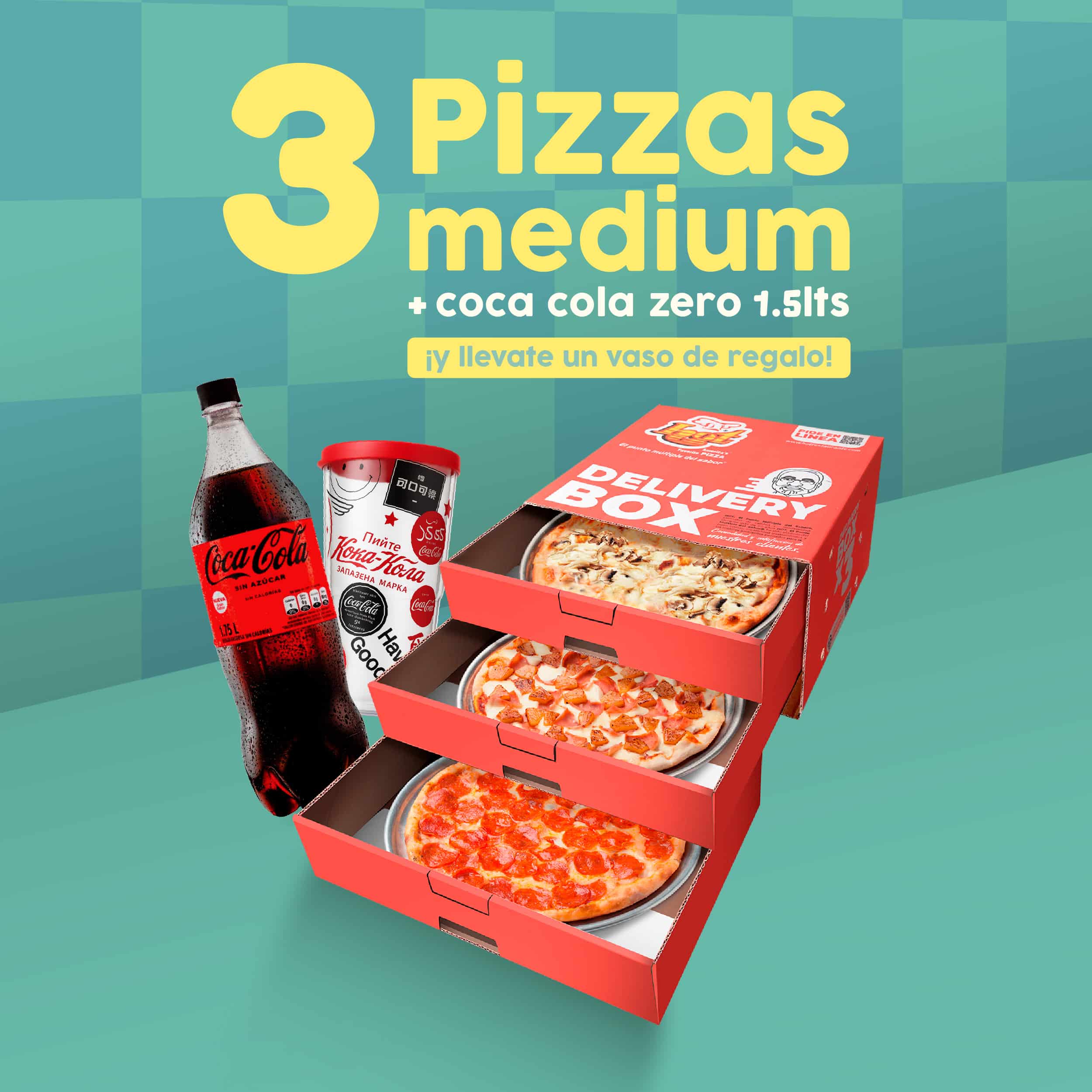 Escoge 3 pizzas completas medium; incluye Cocacola Zero 1.5L Oferta solo para domicilio, no válida en establecimientos físicos. Clic aquí para más información.